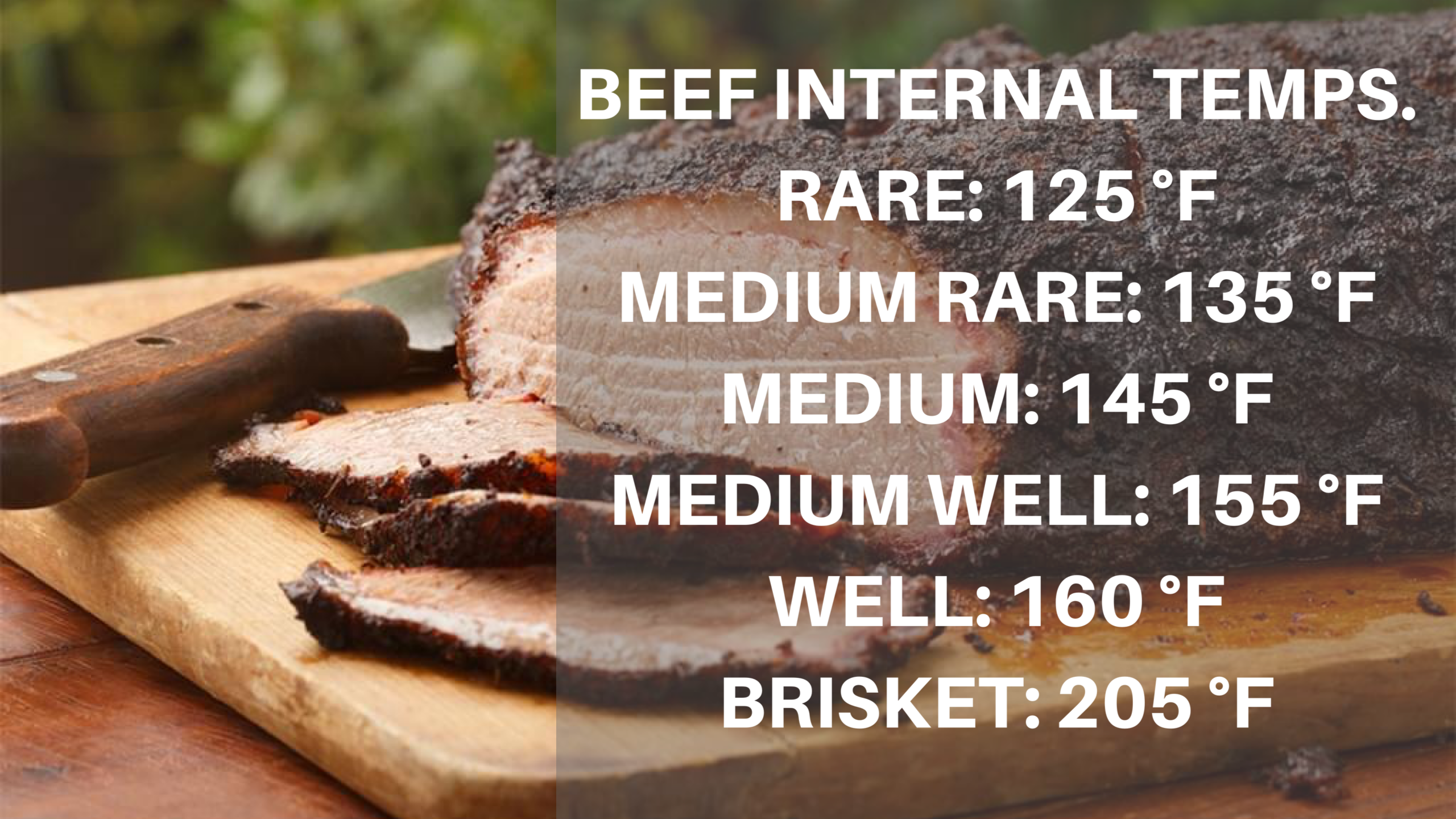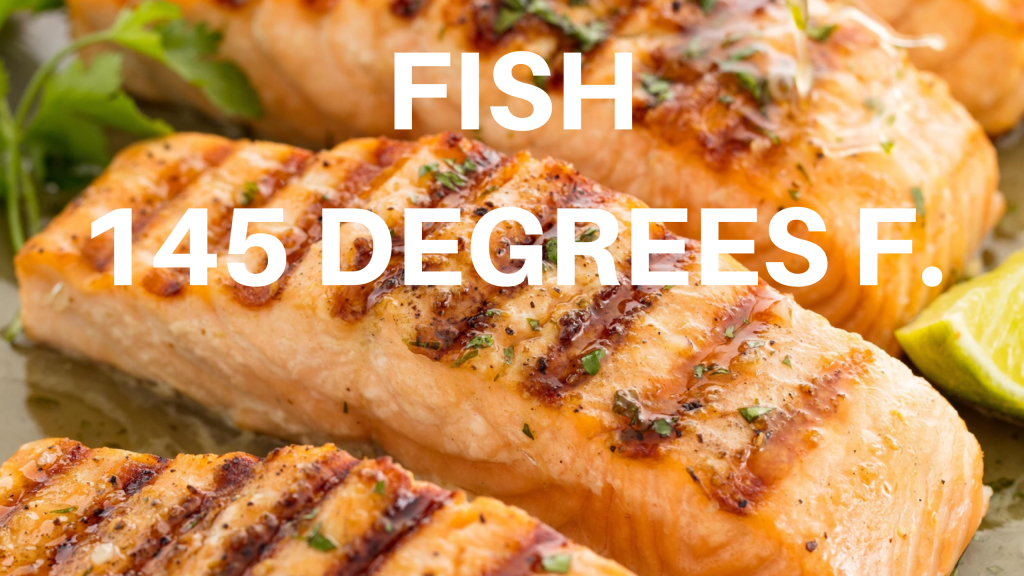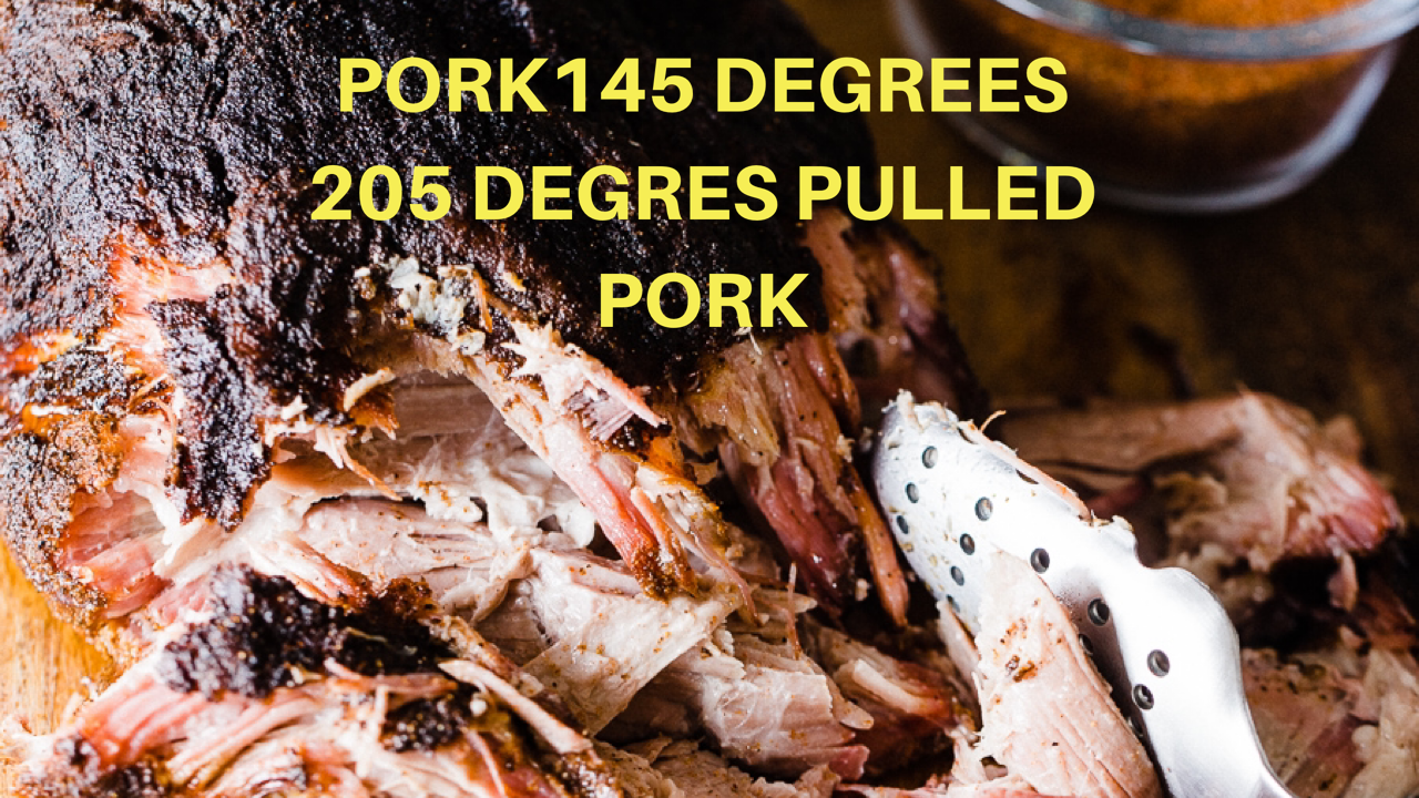 To be safe, most meats need to be cooked to an internal temperature of 145 degrees, and poultry cooked to 165 degrees. However, to get real tender barbecue you want a higher final temperature, at around 180 degrees. (See above photos for certain meat internal temperatures)